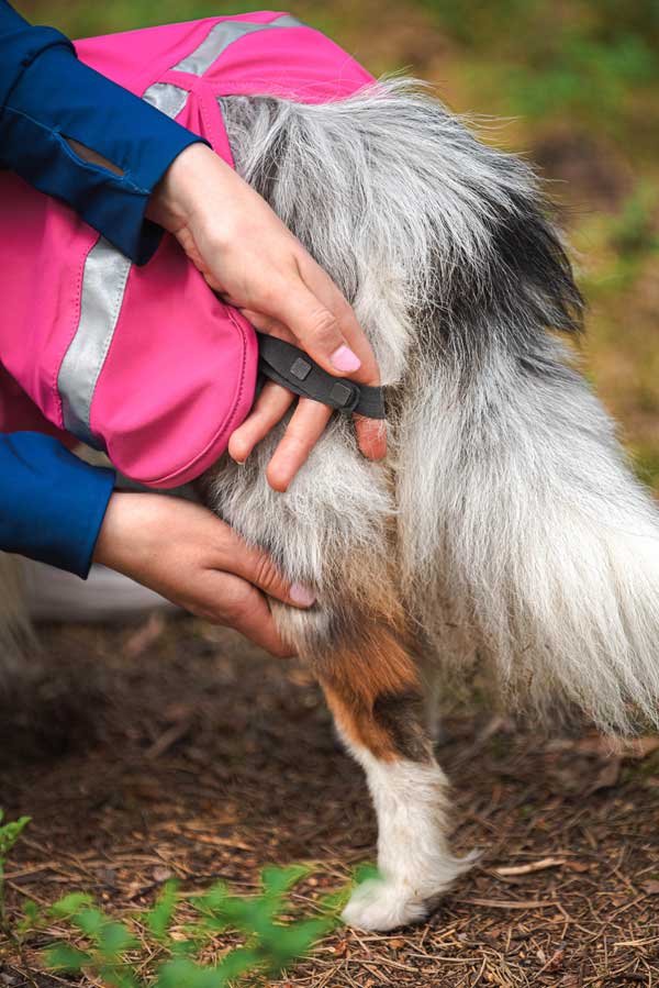KuoriPomppa ist ein wasser- und winddichter Hunderegenmantel für den ganzjährigen Gebrauch. Diese ungefütterte Shell Jacke ist die neueste Ergänzung des Pomppa-Regenbekleidungssortiments: